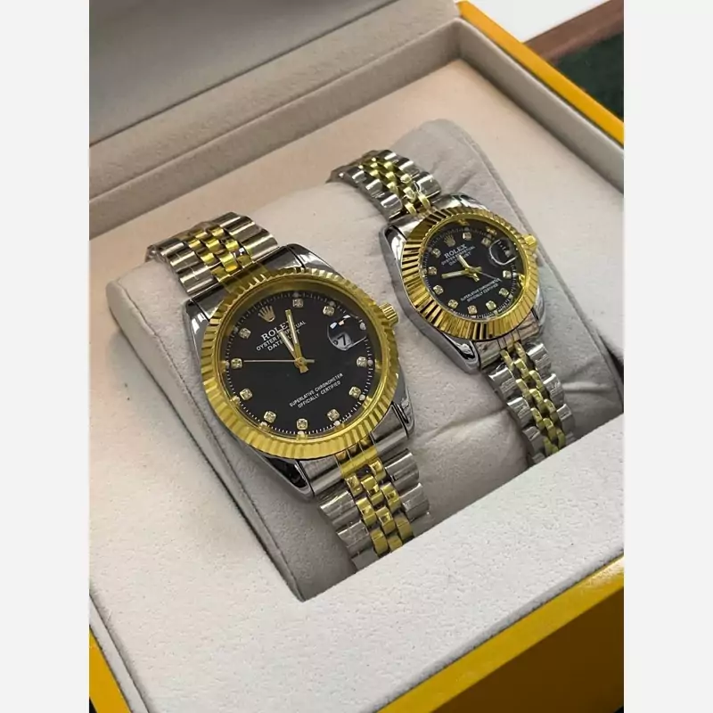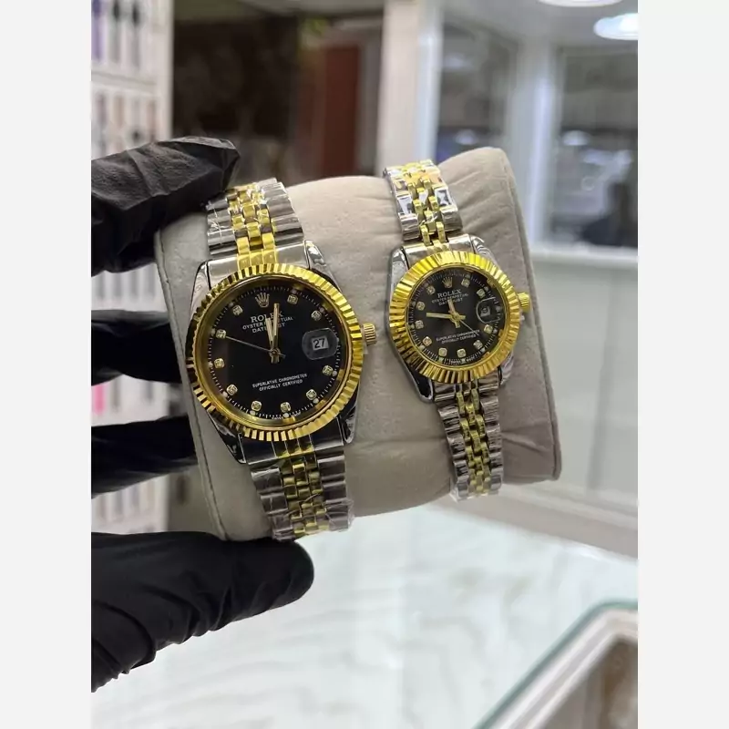 ست ساعت رولکس بنداستیل دورنگ صفحه مشکی. شیشه ذره بینی