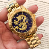 ساعت مچی مردانه مارک رولکس طرح دراگون دارای تقویم کیفیت عالی بنداستیل طلایی صفحه سورمه ای شش ماه گارانتی موتور دارای جعب
