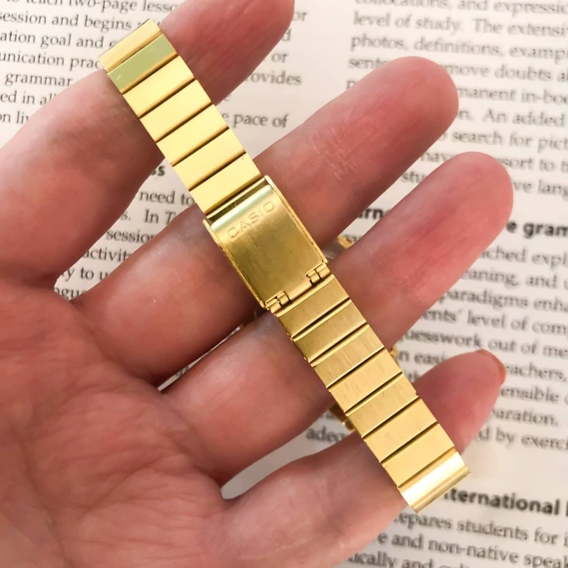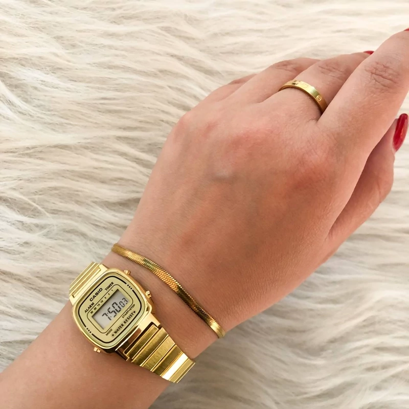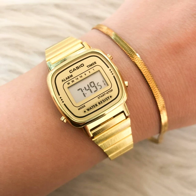 ساعت زنانه کاسیو کامپیوتری طلایی بهمراه دستبند و انگشتر دارای کرنومتر. ساعت دیجیتال. تقویم و... کیفیت عالی مارک کاسیو Casio دارای جعبه کادویی مخصوص ساعت قطر شیشه ساعت حدودا ۲۵ میلیمتر صفحه مشکی موجوده