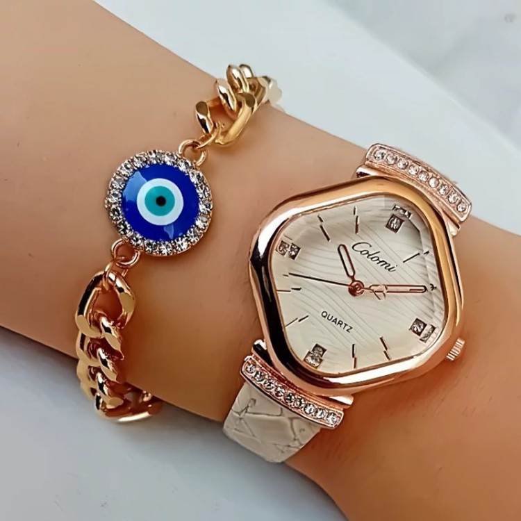 ساعت بند چرم صفحه لوزی و دستبند چشم زخم