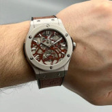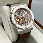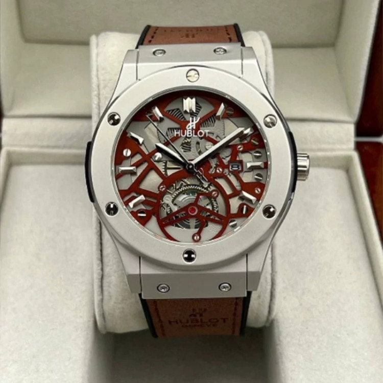 قبل از خرید موجودی رنگ گرفته شود ساعت مچی مردانه مارک هابلوت طرح اتومات دارای تقویم کیفیت عالی بندپیو طوسی قاب نقره ای شش ماه گارانتی موتور دارای جعبه کادویی و کارت ضمانت قطر شیشه ساعت حدود 38 میلیمتر رنگ بندی کامل شارژ شد
