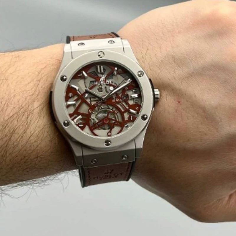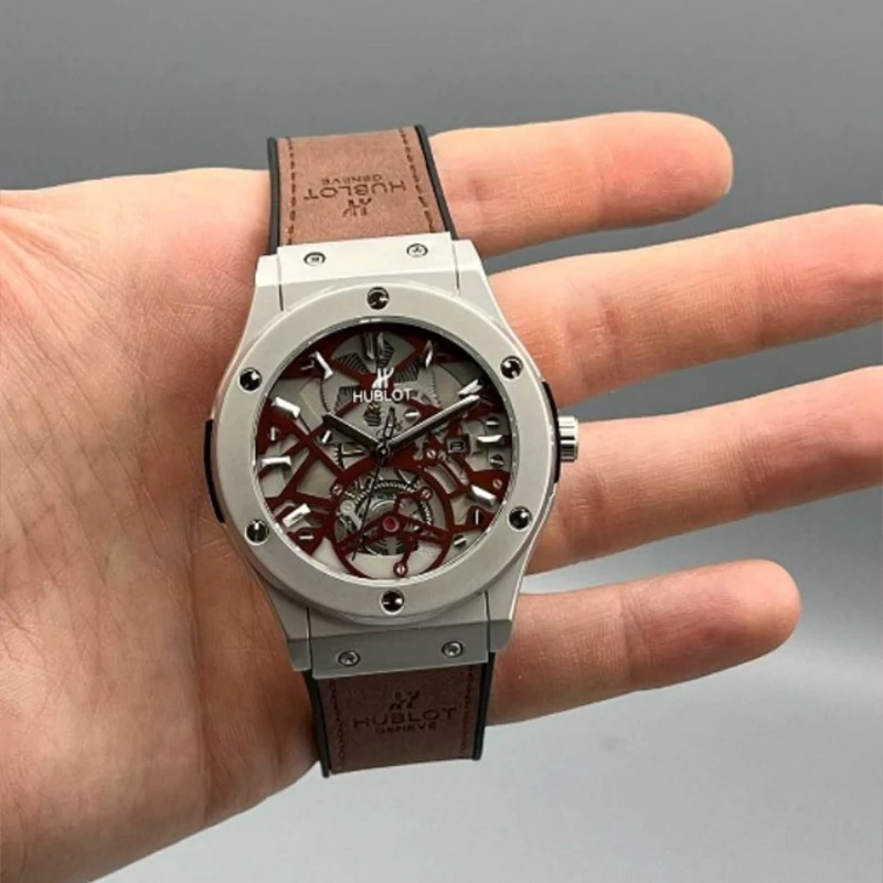 قبل از خرید موجودی رنگ گرفته شود ساعت مچی مردانه مارک هابلوت طرح اتومات دارای تقویم کیفیت عالی بندپیو طوسی قاب نقره ای شش ماه گارانتی موتور دارای جعبه کادویی و کارت ضمانت قطر شیشه ساعت حدود 38 میلیمتر رنگ بندی کامل شارژ شد
