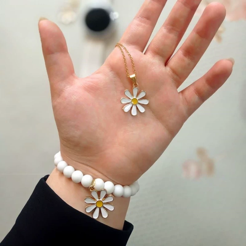 نیمست بابونه طلایی سفید شامل گردنبند و گوشواره