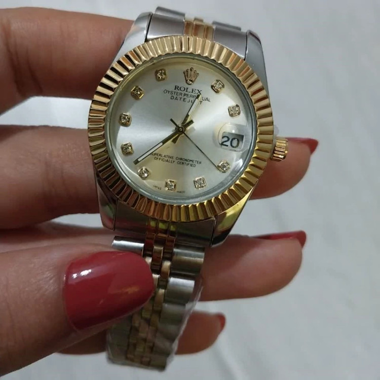 ست ساعت رولکس بند و قاب فول استیل دورنگ نقره ای طلایی صفحه سفید رنگ ثابت کیفیت درجه یک . تقویم دار