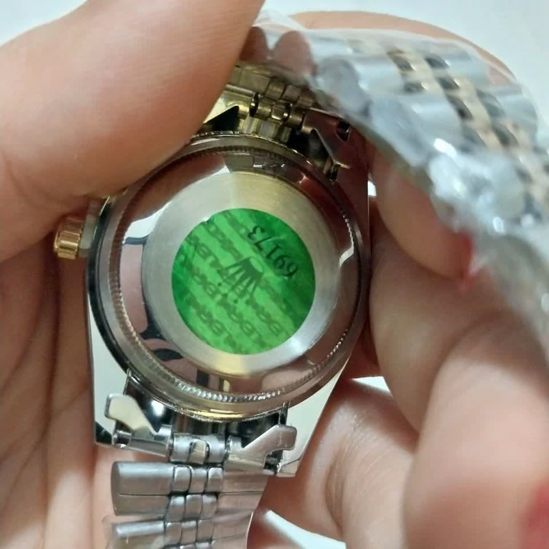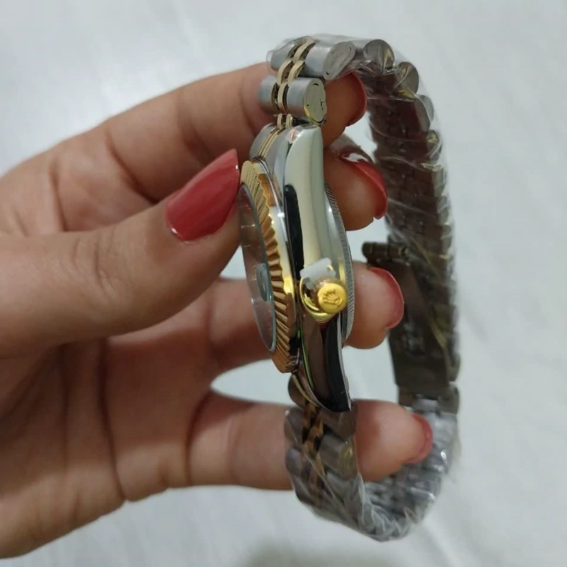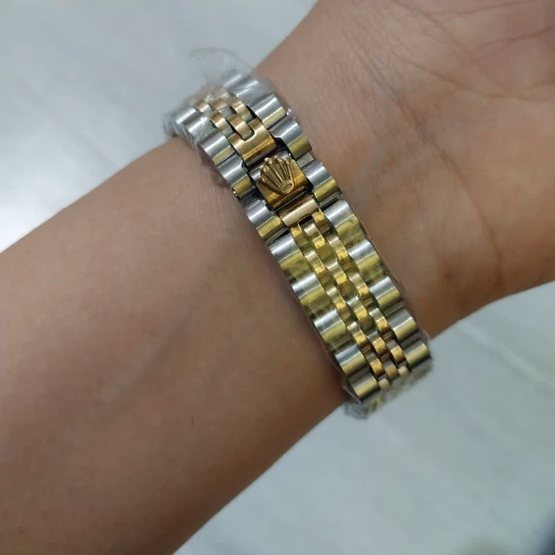 ست ساعت رولکس بند و قاب فول استیل دورنگ نقره ای طلایی صفحه سفید رنگ ثابت کیفیت درجه یک . تقویم دار