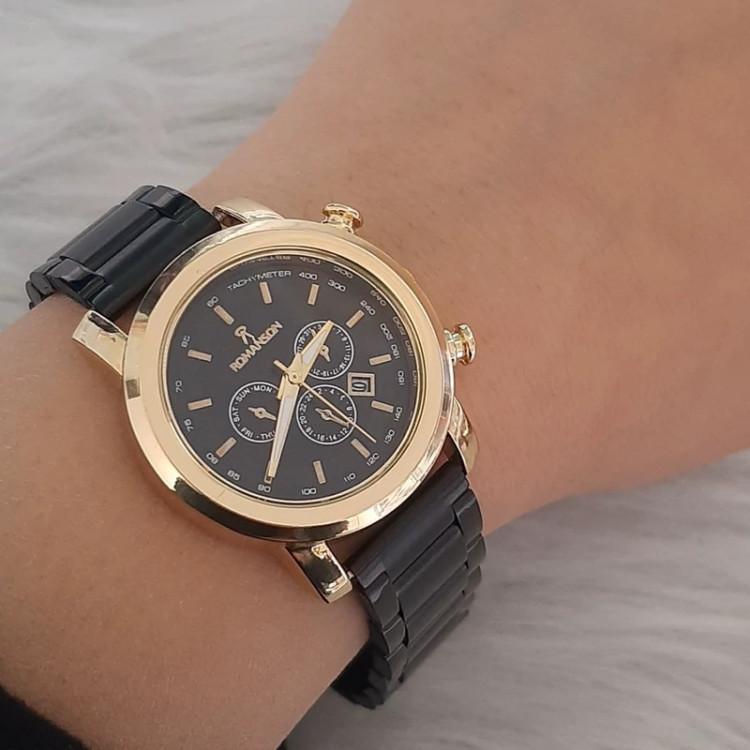 ساعت مردانه رومانسون مشکی صفحه مشکی قاب طلایی.