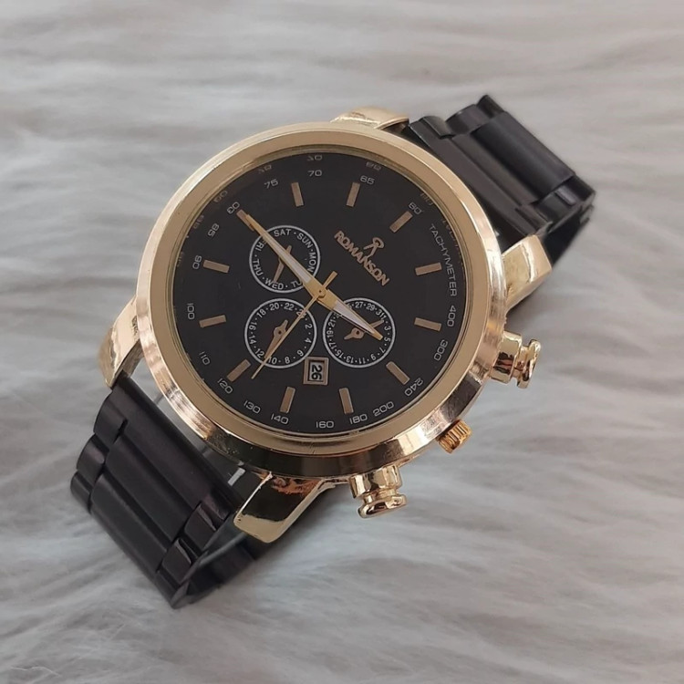ساعت مردانه رومانسون بنداستیل مشکی صفحه مشکی قاب طلایی. طرح سه موتوره