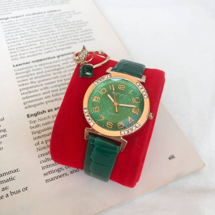 ساعت زنانه بند چرم سبز قاب رزگلد بهمراه انگشتر