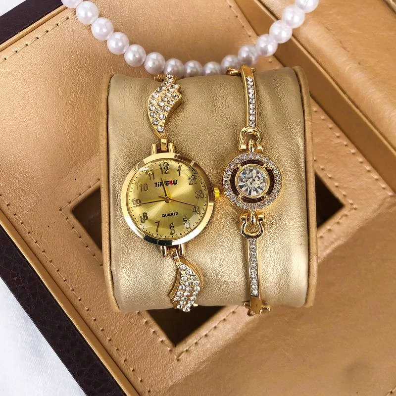 ساعت زنانه مجلسی طلایی صفحه طلایی نگین دار مارک تایم فور اندازه صفحه 20 میل 6ماه گارانتی موتور ست با دستبند ارسال رایگان بهمراه جعبه