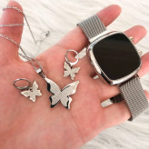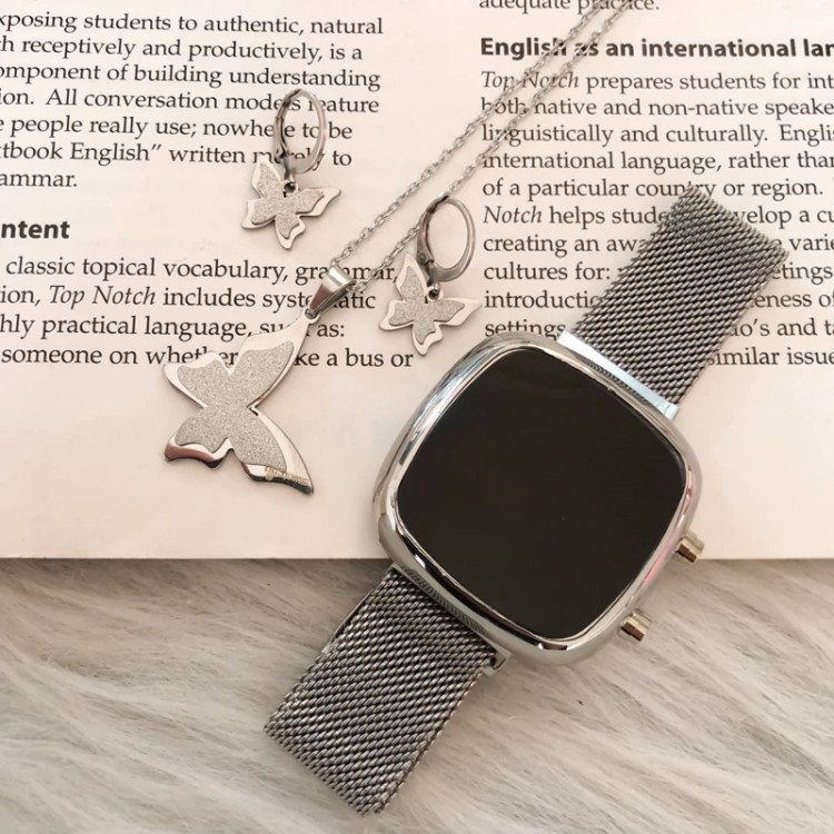 نیم ست پروانه نقره ای رنگ ثابت همراه با ساعت مگنتی مربع دو کلید کیفیت عالی دارای جعبه کادویی مخصوص ساعت وارداتی از دبی