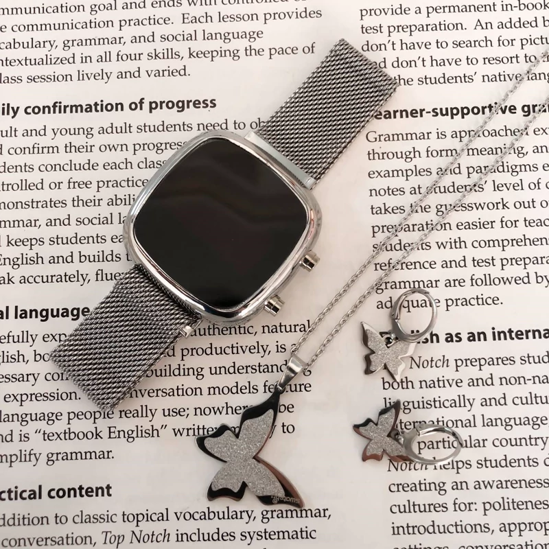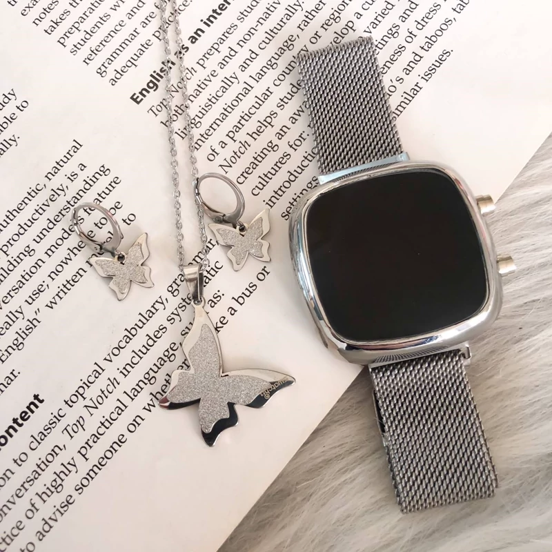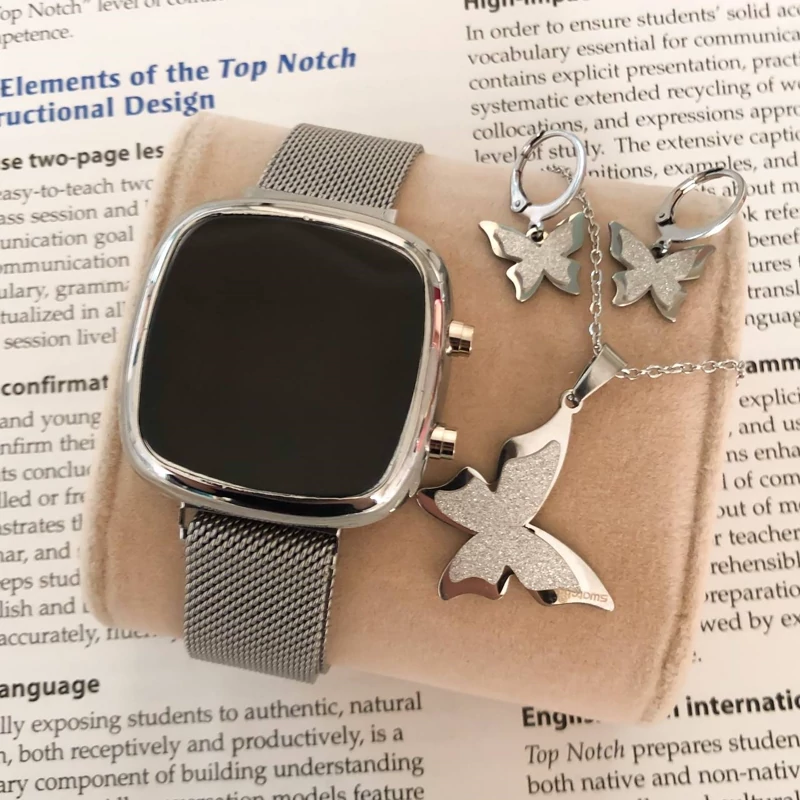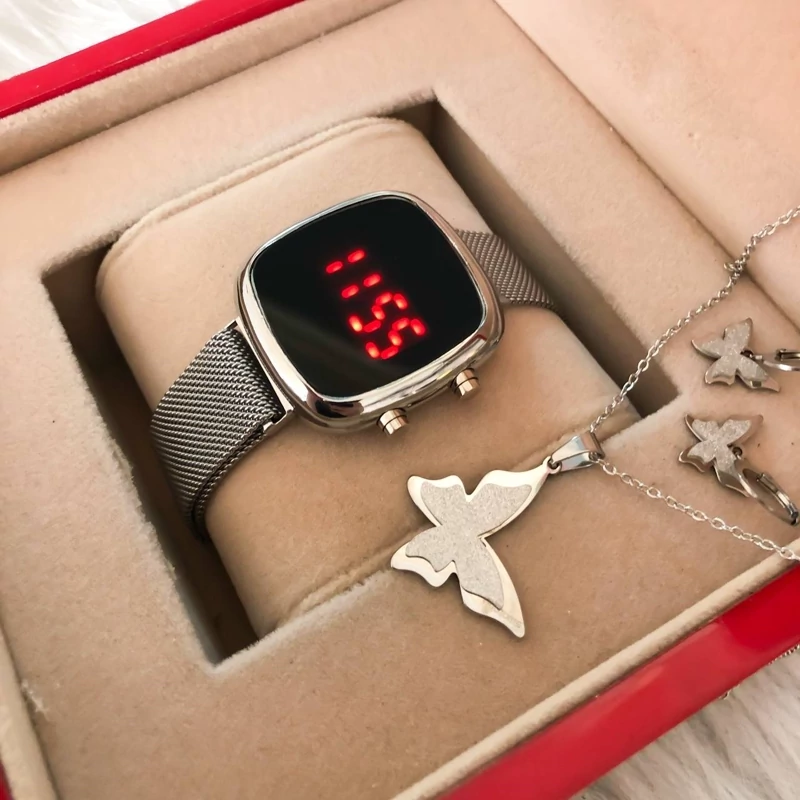 نیم ست پروانه نقره ای رنگ ثابت همراه با ساعت مگنتی مربع دو کلید کیفیت عالی دارای جعبه کادویی مخصوص ساعت وارداتی از دبی
