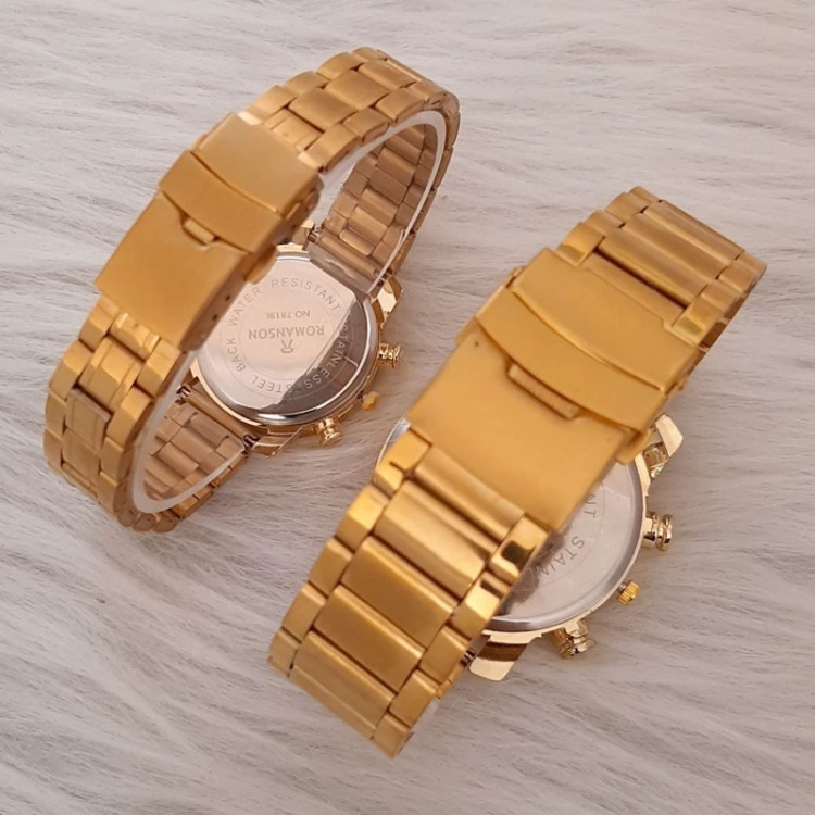 ست ساعت زنانه و مردانه مارک رومانسون بنداستیل طلایی صفحه سفید. طرح سه موتوره