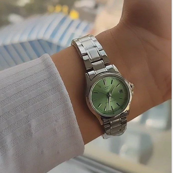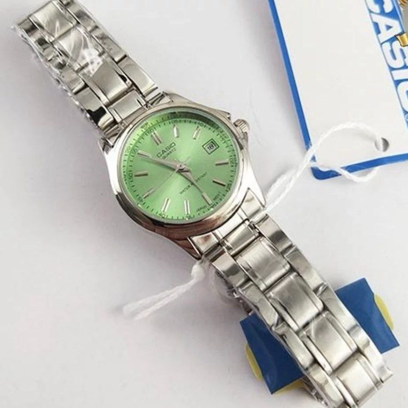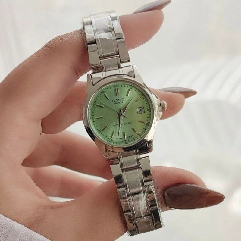 ساعت مچی ست زنانه و مردانه کاسیو نقره ای صفحه سبز روشن