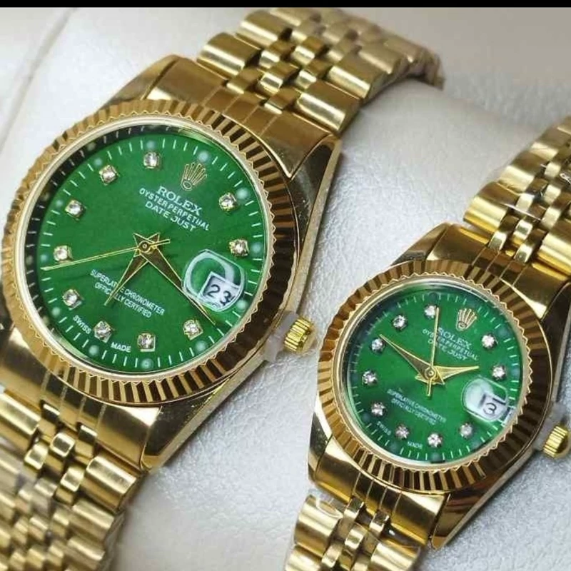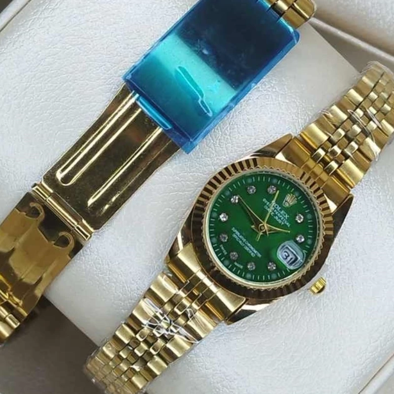 ساعت زنانه و مردانه مارک رولکس بند و قاب طلایی صفحه سبز دارای روز شمار ۶ماه گارانتی موتور ارسال ب همراه جعبه