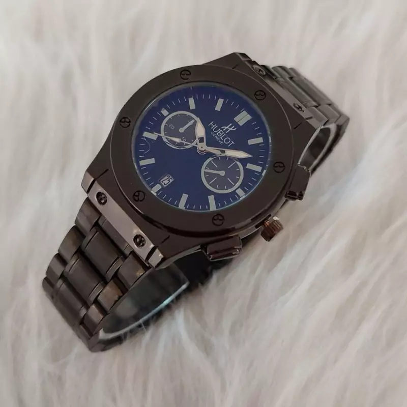 ست ساعت زنانه و مردانه مارک هابلوت بنداستیل مشکی صفحه مشکی قاب مشکی. طرح سه موتوره. شیشه رنگی دارای تقویم. کیفیت عالی. شش ماه گارانتی موتور ارسال با جعبه چوبی و کارت ضمانت قطر شیشه ساعت حدودا مردانه ۳۸ میلیمتر قطر شیشه ساعت زنانه حدودا ۲۸ میلیمتر