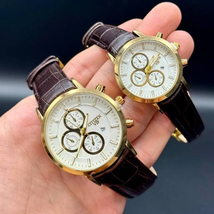 ساعت مچی ست سیتیزن vip بند چرم قهوه ای طرح سه موتوره