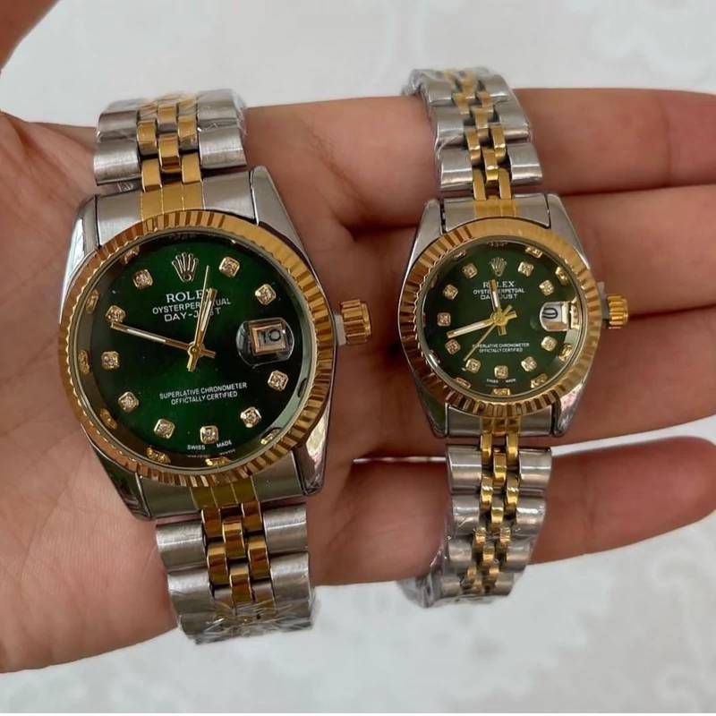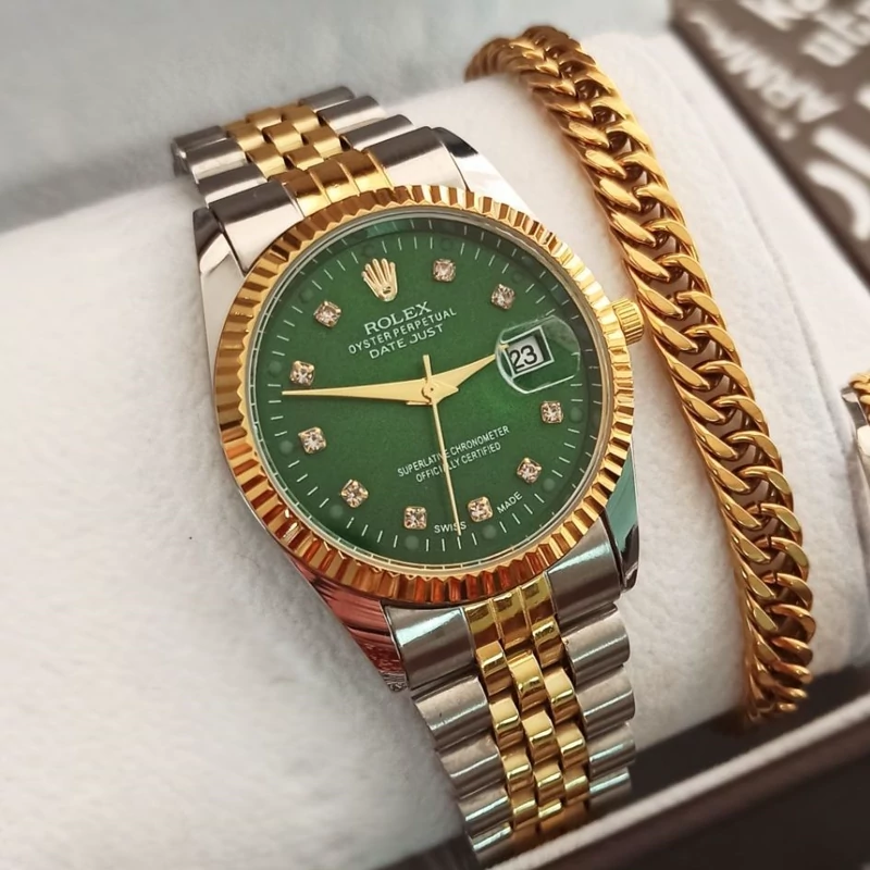 ساعت رولکس بند دو رنگ نقره ای طلایی صفحه سبز تقویم دار، با گارانتی موتور و جعبه کادویی و