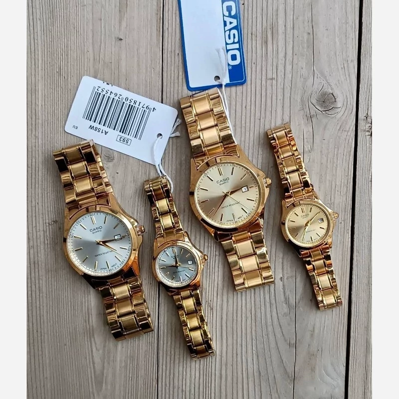ساعت زنانه و مردانه کاسیو طلایی صفحه طلایی تقویم دار با گارانتی موتور ارسال رایگان بهمراه جعبه فروش ب صورت ست و تک رنگبندس متنوع