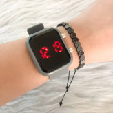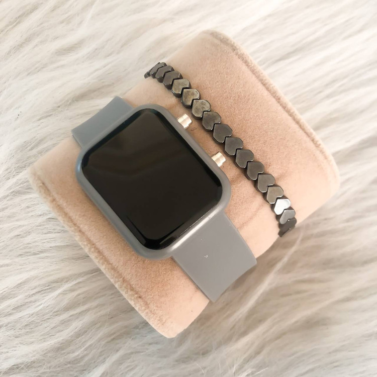 ست ساعت ال ای دی بندژله ای مستطیل طوسی همراه با دستبند حدید