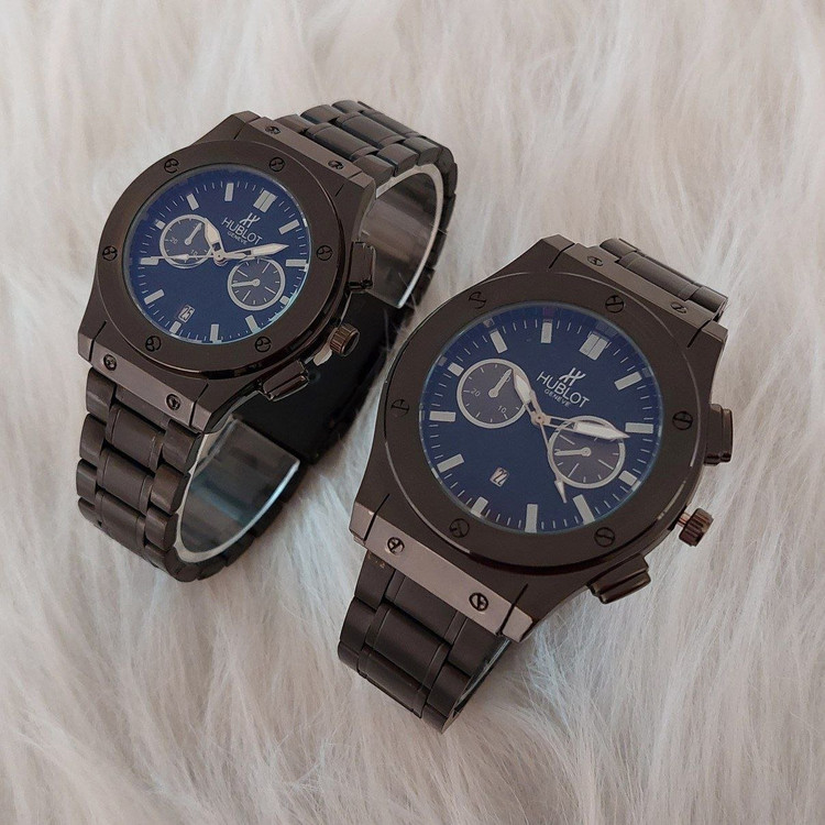 ست ساعت زنانه و مردانه مارک هابلوت بنداستیل مشکی صفحه مشکی قاب مشکی. طرح سه موتو