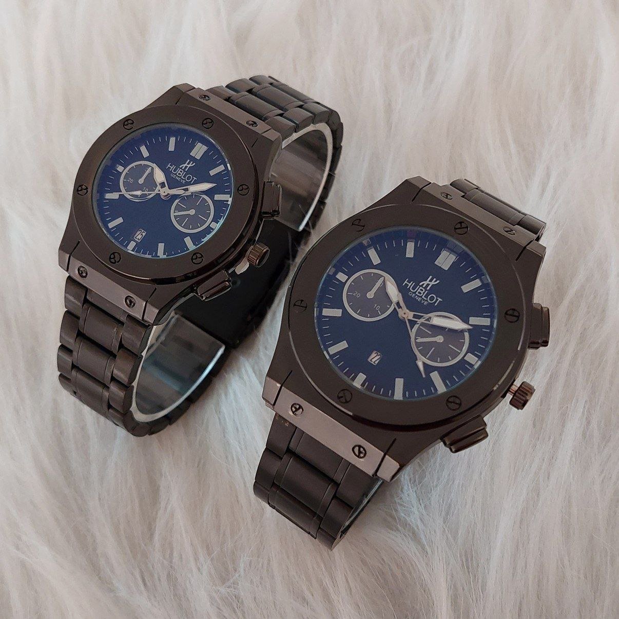 ست ساعت زنانه و مردانه مارک هابلوت بنداستیل مشکی صفحه مشکی قاب مشکی. طرح سه موتوره. شیشه رنگی