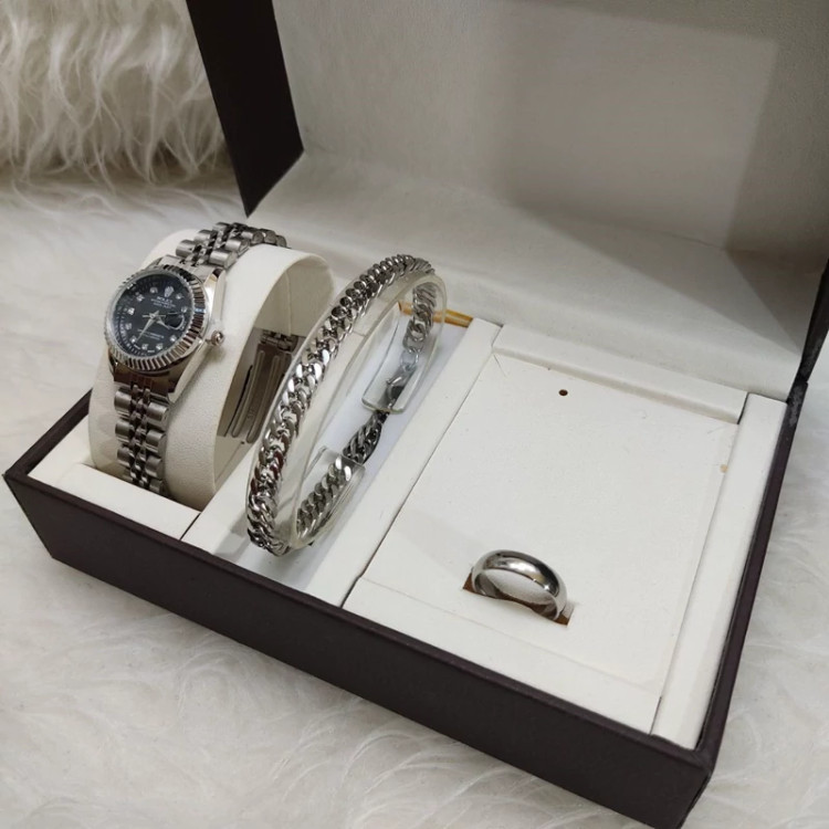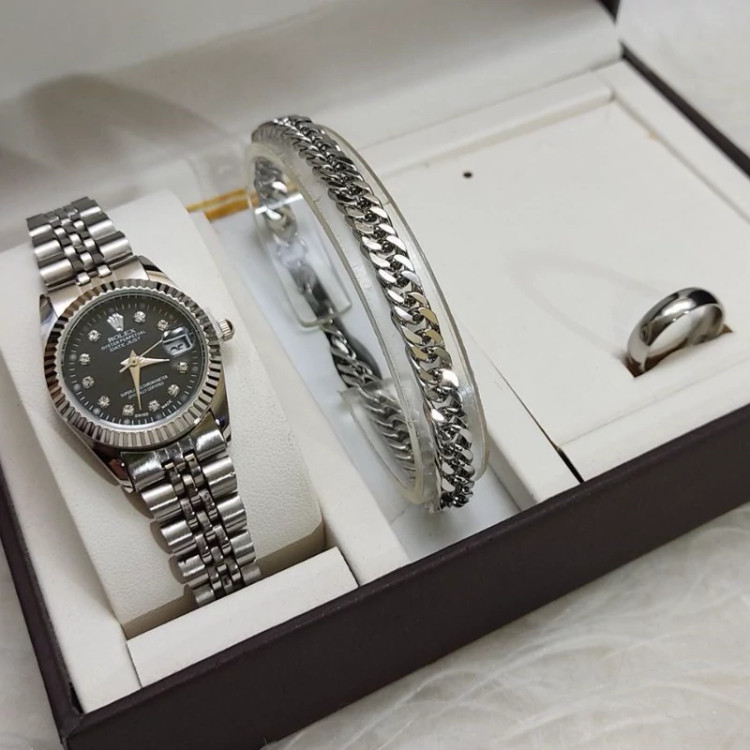 ست ساعت مچی و دستبند و حلقه زنانه و مردانه رولکس نقره ای