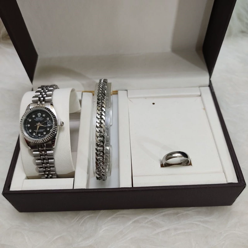 ست ساعت مچی و دستبند و حلقه زنانه و مردانه رولکس نقره ای