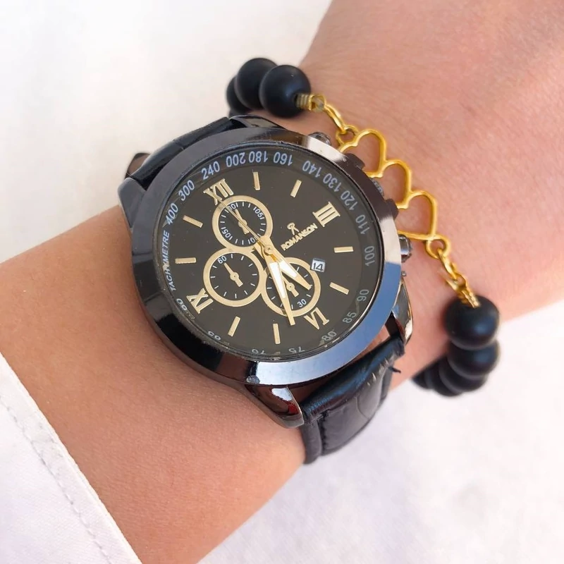 ساعت زنانه رومانسون بند چرم مشکی قاب مشکی صفحه مشکی طرح 3 موتوره ،تقویم دار بهمراه دستبند 6 ماه گارانتی موتور ،ارسال رایگان بهمراه جعبه