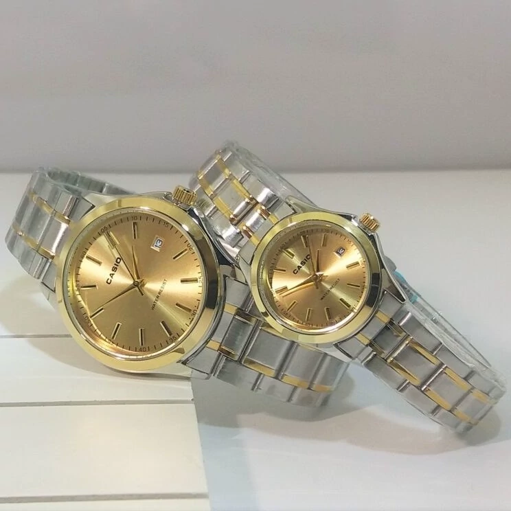 ساعت ست و تکی زنانه و مردانه عقربه ای کاسیو CASIO صفحه گرد سفید بند استیل دو رنگ طلایی نقره ایی+باطری اضافی - تک کد 2727