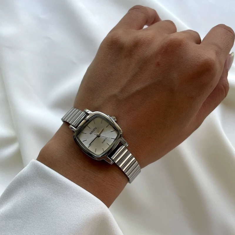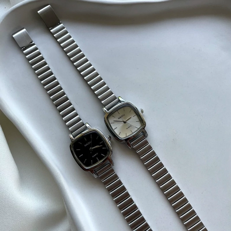 ساعت مچی زنانه نایدو naidu منیمال بند استیل کرکره ایی مربعی سفید+باطری اضافی کد 9218