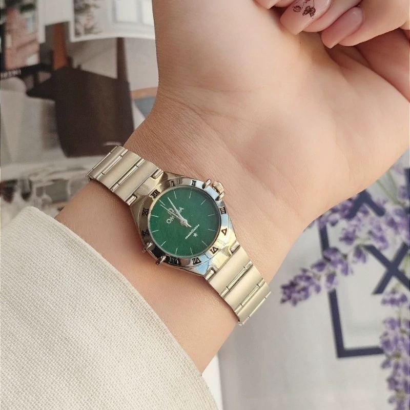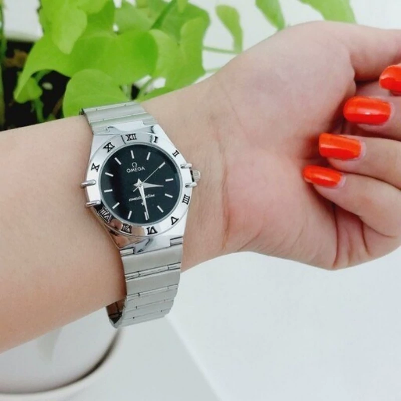 ساعت مچی زنانه امگا صفحه گرد سفید بنده استیل نقره ایی کد 1997