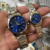 ساعت ست و تکی زنانه و مردانه عقربه ای کاسیو CASIO صفحه گرد آبی بند استیل دو رنگ طلایی نقره ایی+باطری اضافی تک کد 2729