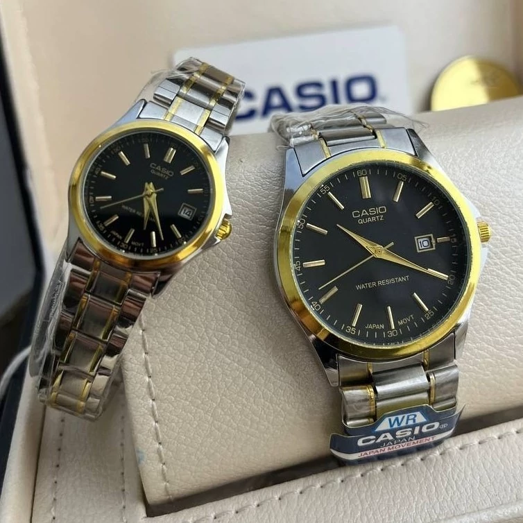ساعت ست و تکی زنانه و مردانه عقربه ای کاسیو CASIO صفحه گرد آبی بند استیل دو رنگ طلایی نقره ایی+باطری اضافی تک کد 2729