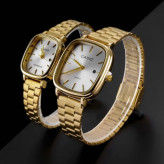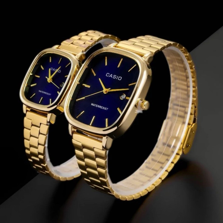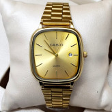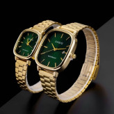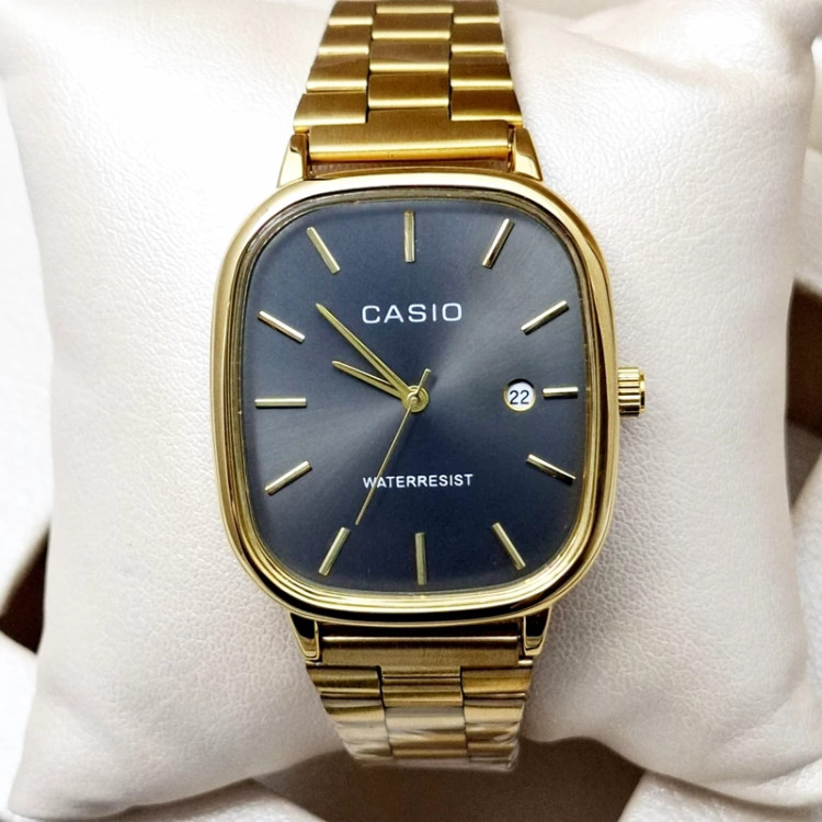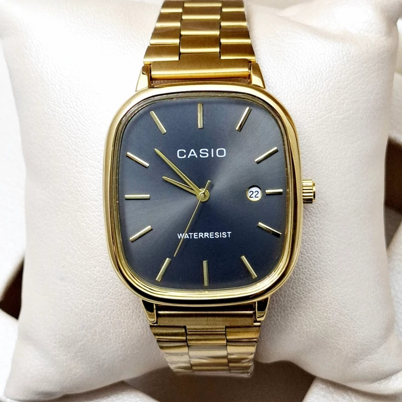 ست ساعت مچی مردانه کاسیو صفحه مربعی سبز بند طلایی استیل شیک+باطری اضافی کد 2647