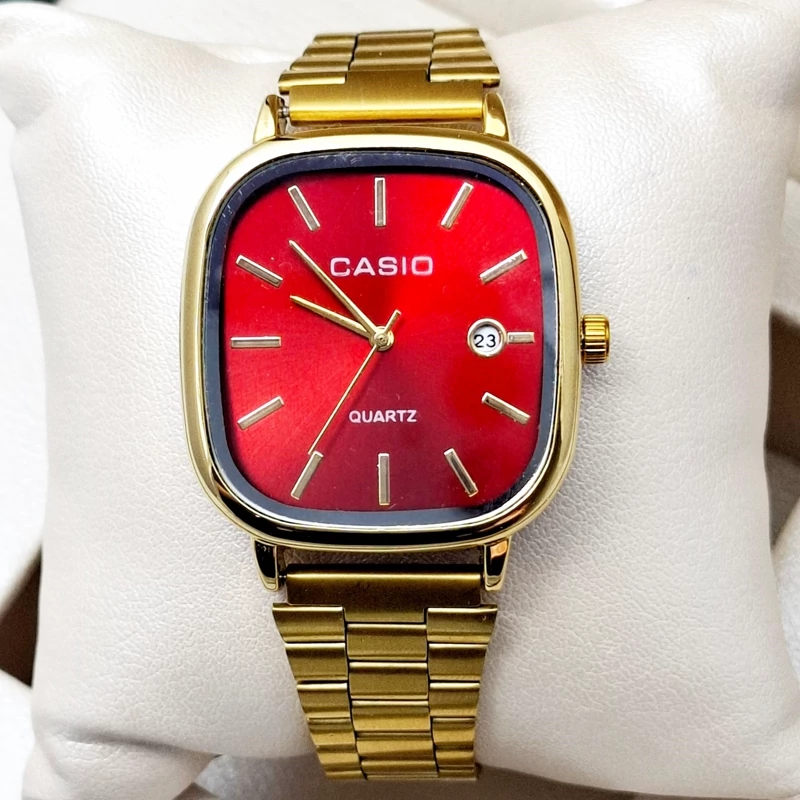 ست ساعت مچی مردانه کاسیو صفحه مربعی سبز بند طلایی استیل شیک+باطری اضافی کد 2647