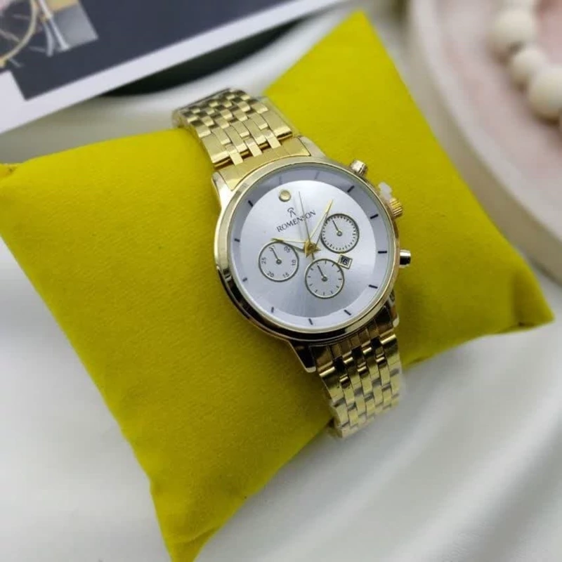 ساعت زنانه رومانسون بند طلایی نقره ای صفحه مشکی+باطری اضافی کد 1770