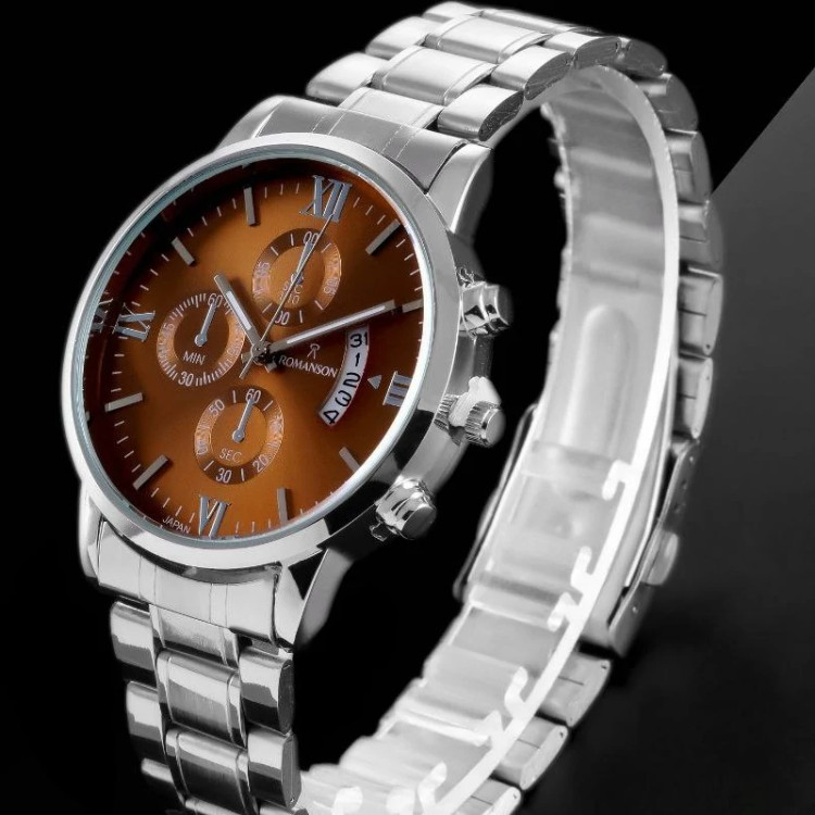 ساعت مچی مردانه رومانسون صفحه قهوه ایی بند نقره ایی+باطری اضافی کد4068