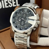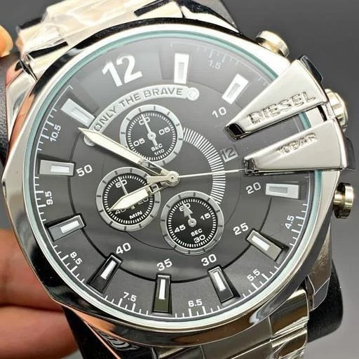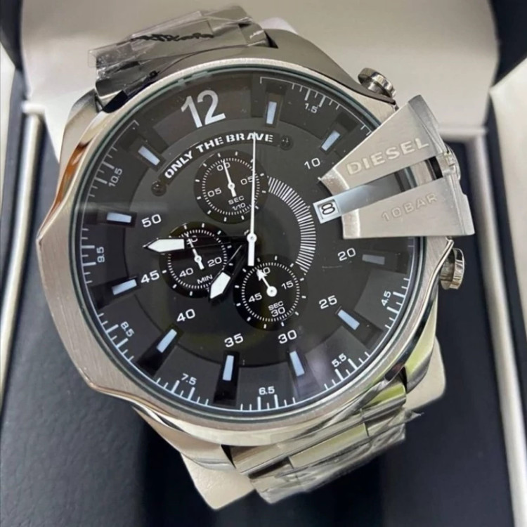 ساعت دیزل مردانه بنداستیل نقره ایی صفحه مشکی شاخ دار تقویم دار حک برند دیزل+باطری اضافی کد 2758