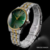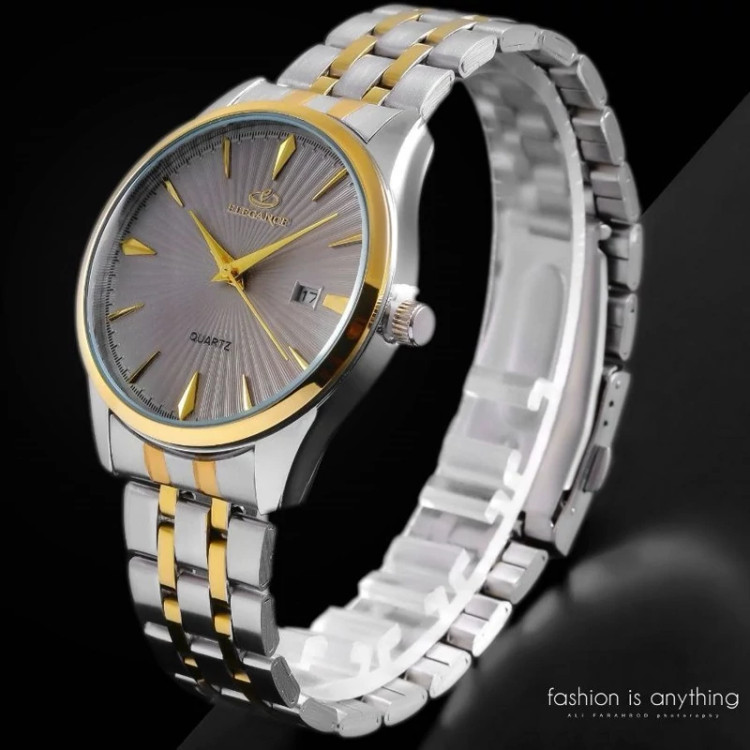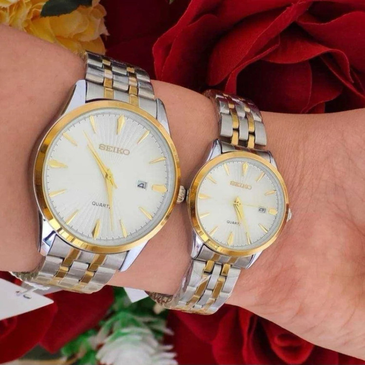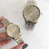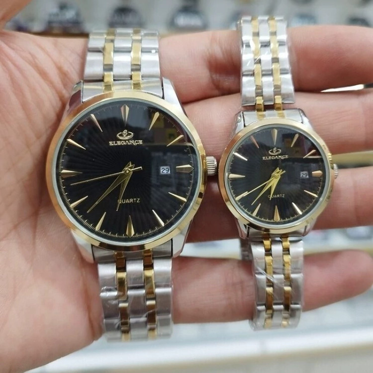 ست ساعت مچی مردانه و زنانه الگانس صفحه مشکی بند دو رنگ +باطری اضافی کد 2552