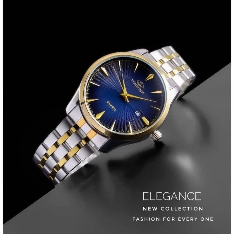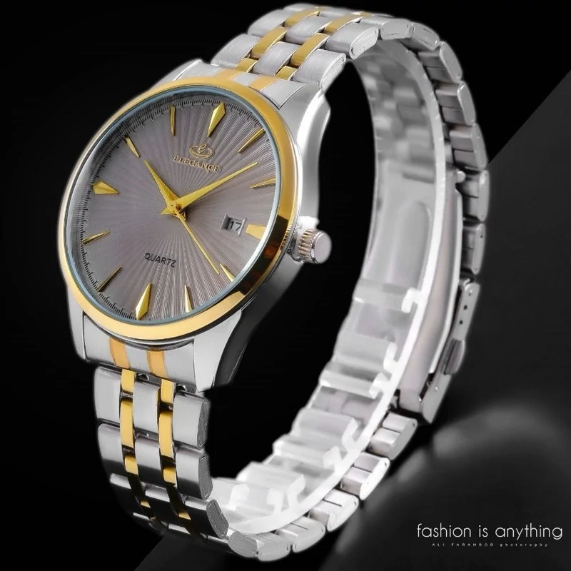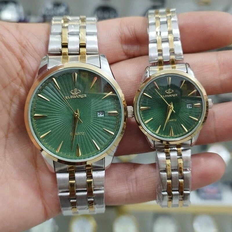ست ساعت مچی مردانه و زنانه الگانس صفحه مشکی بند دو رنگ +باطری اضافی کد 2552