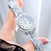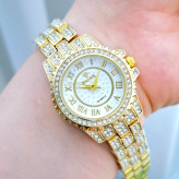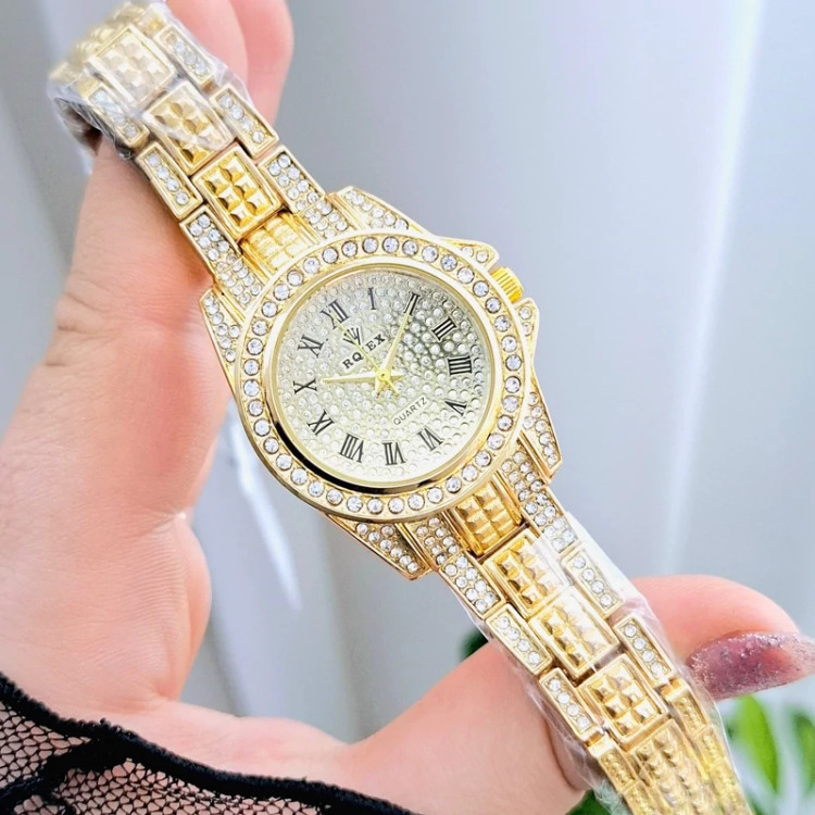 ساعت مچی زنانه فول نگین ROLEX رولکس بند استیل طلایی صفحه نمایش گرد سفید مجلسی شیک و جدید کد 3150