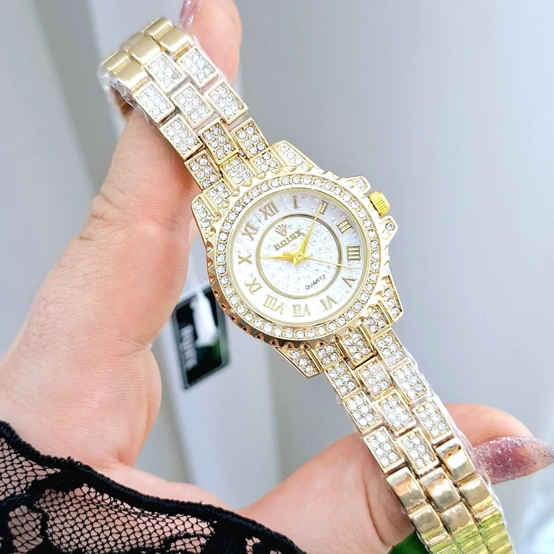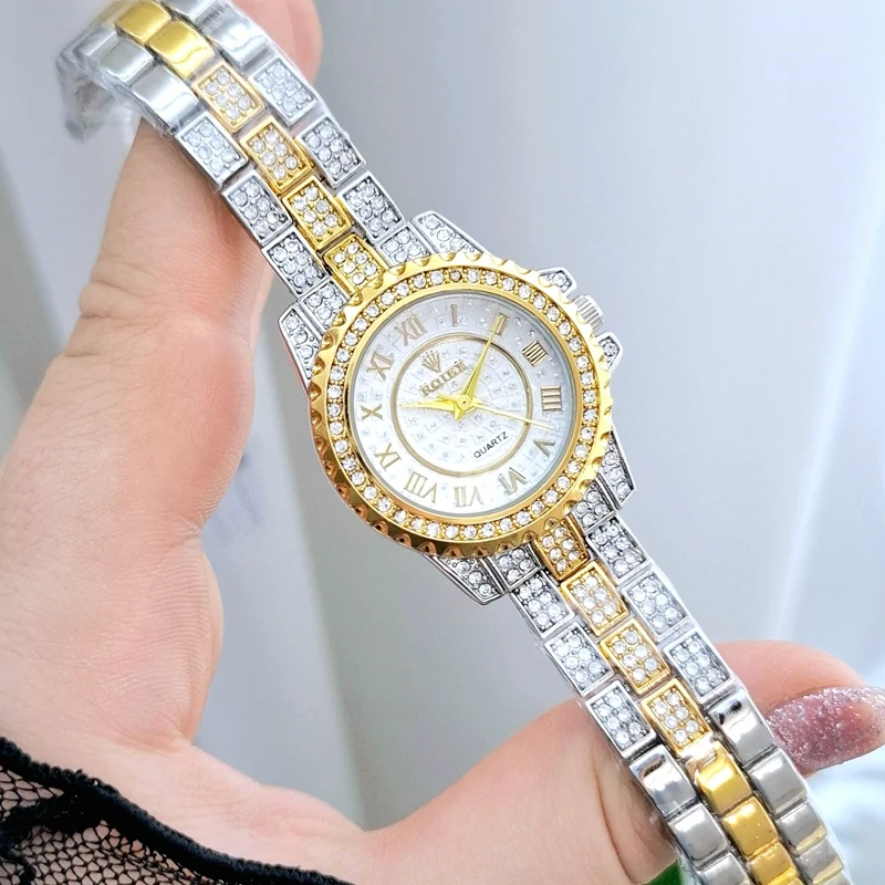 ساعت مچی زنانه فول نگین ROLEX رولکس بند استیل طلایی صفحه نمایش گرد سفید مجلسی شیک و جدید کد 3150
