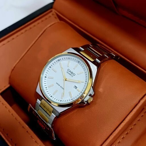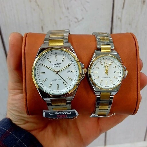 ست ساعت مچی زنانه و مردانه کاسیو Casio بند استیل نقره ایی و طلایی صفحه نمایش سفید+باطری اضافی کد9542