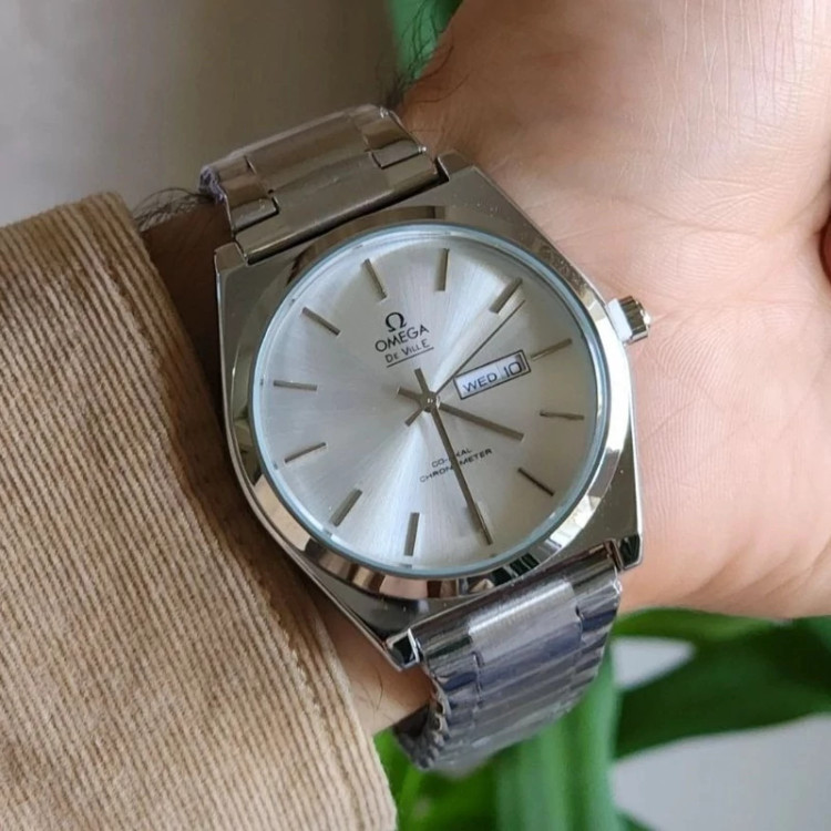ساعت مچی مردانه امگا OMEGA طرح کلاسیک دو تقویم بند استیل نقره ایی صفحه نمایش آبی+باطری اضافی کد 9526