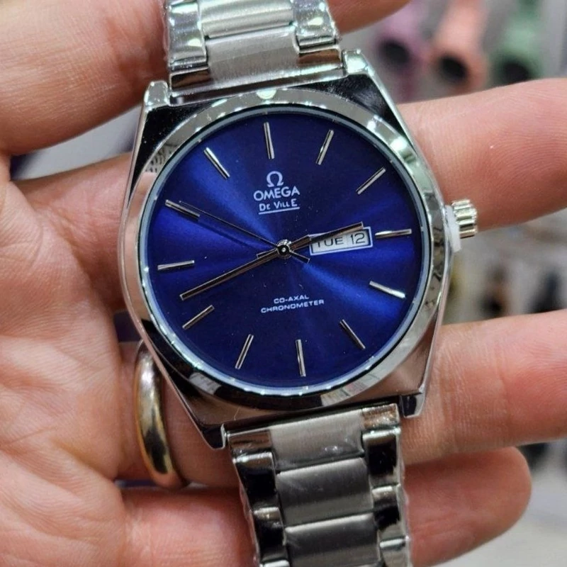 ساعت مچی مردانه امگا OMEGA طرح کلاسیک دو تقویم بند استیل نقره ایی صفحه نمایش آبی+باطری اضافی کد 9526