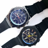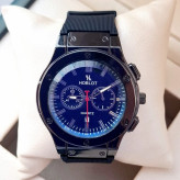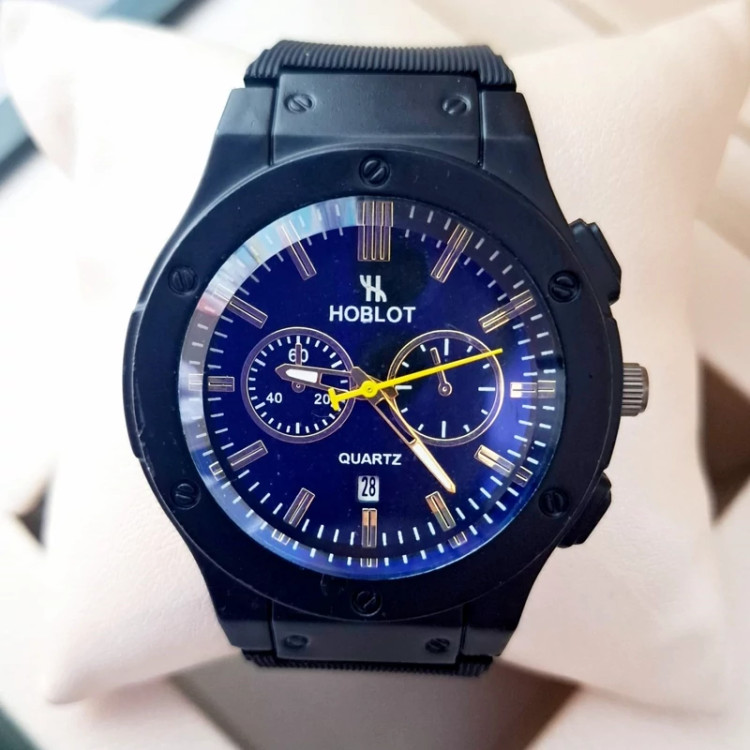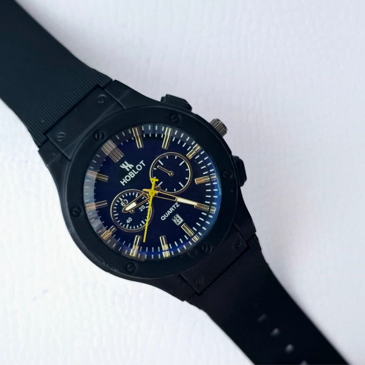 ساعت مچی مردانه (پسرانه) هابلوت Hublot عقره ایی بند سیلیکات مشکی طرح دو موتوره مشکی عقربه طلایی+باطری اضافی کد2741