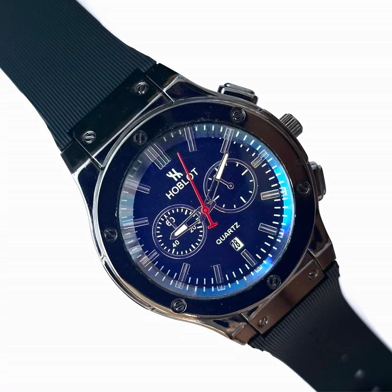 ساعت مچی مردانه (پسرانه) هابلوت Hublot عقره ایی بند سیلیکات مشکی طرح دو موتوره مشکی عقربه طلایی+باطری اضافی کد2741