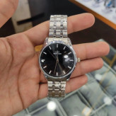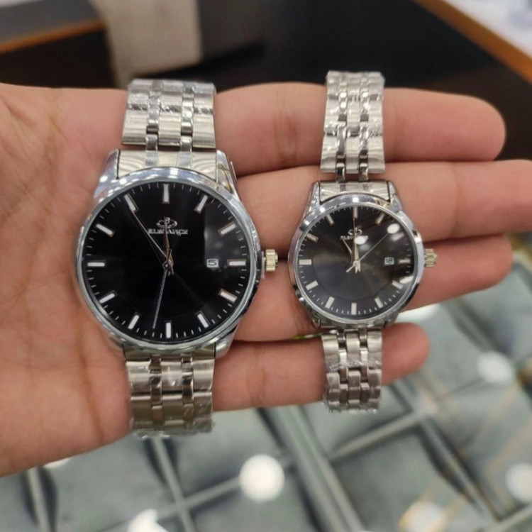 ست ساعت مچی زنانه و مردانه الگانس صفحه مشکی بند نقره ایی+باطری اضافی کد 2569