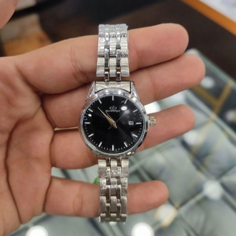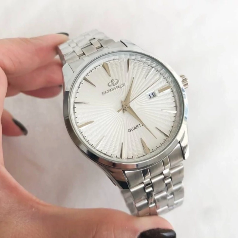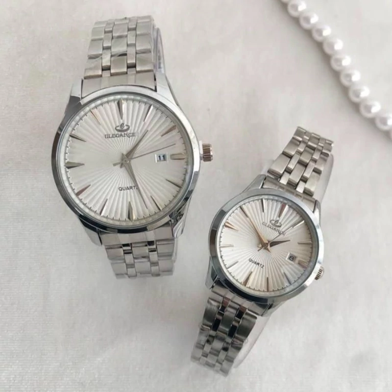 ست ساعت مچی زنانه و مردانه الگانس صفحه مشکی بند نقره ایی+باطری اضافی کد 2569