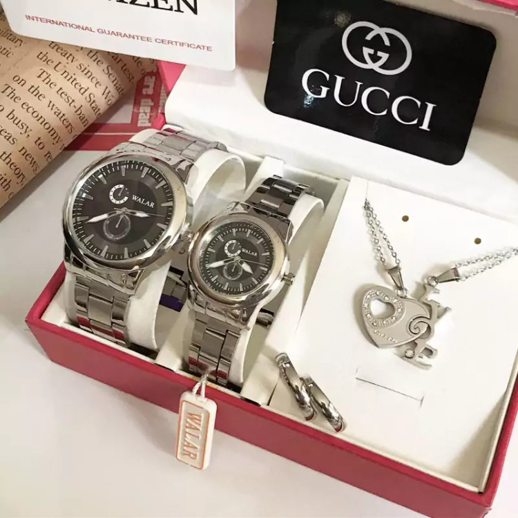 ست ساعت زنانه و مردانه با گردنبند پازلی و حلقه کد5096 ساعت استیل تایوانی ضد آب مارک معروف WALAR کد 986500